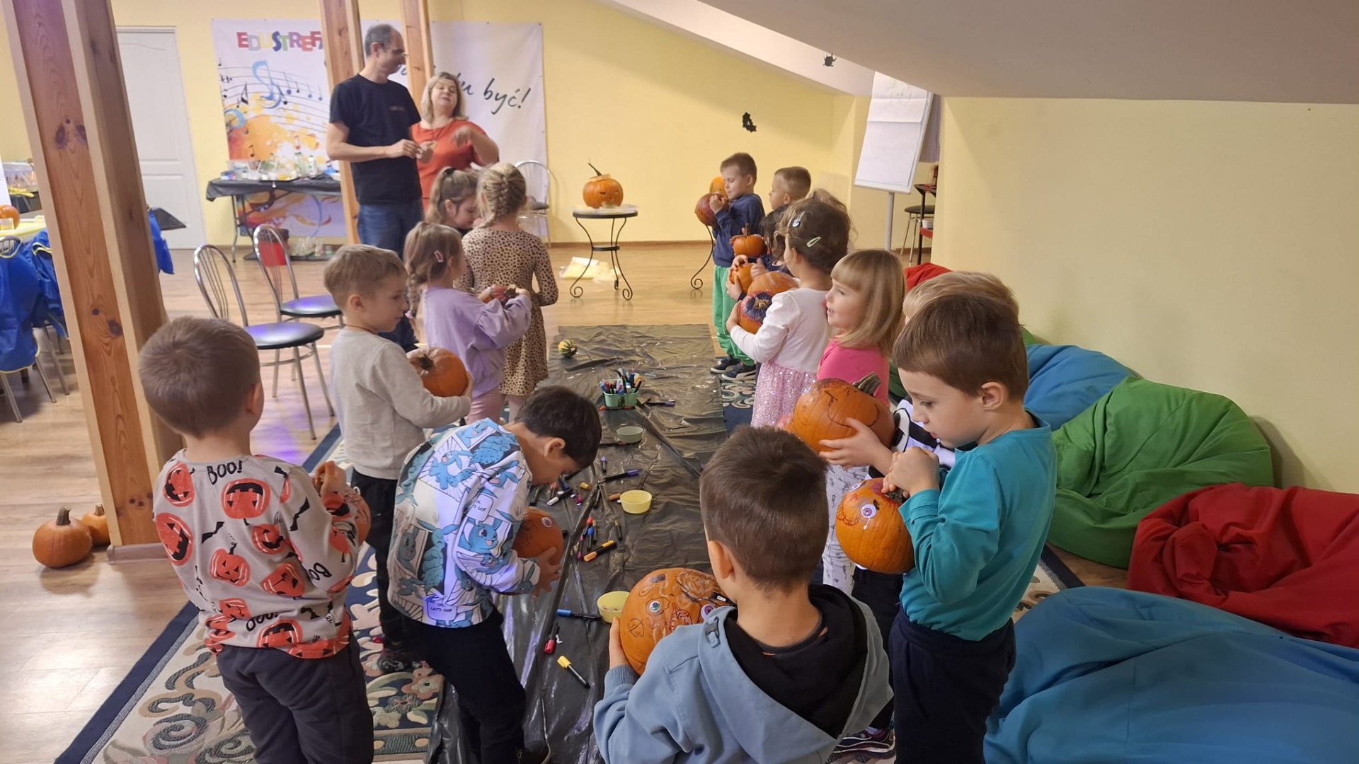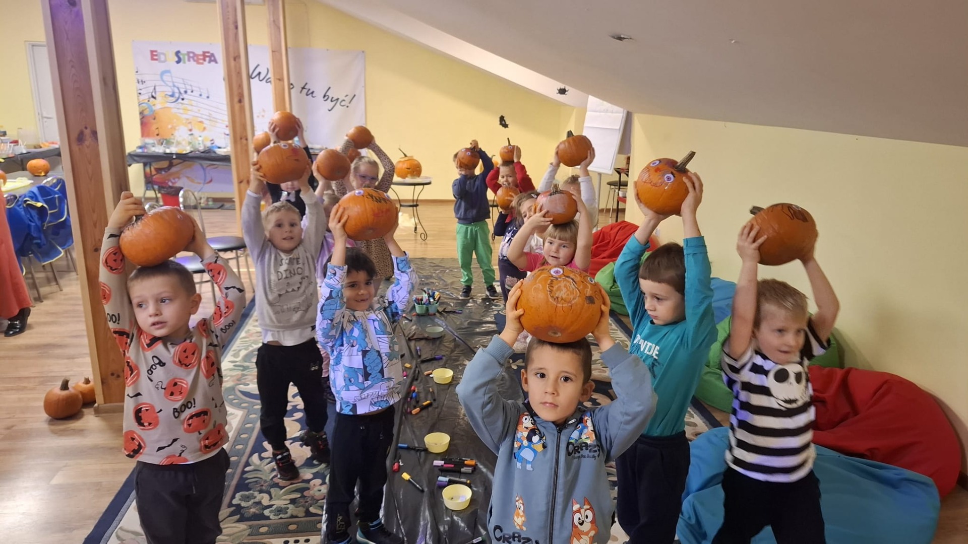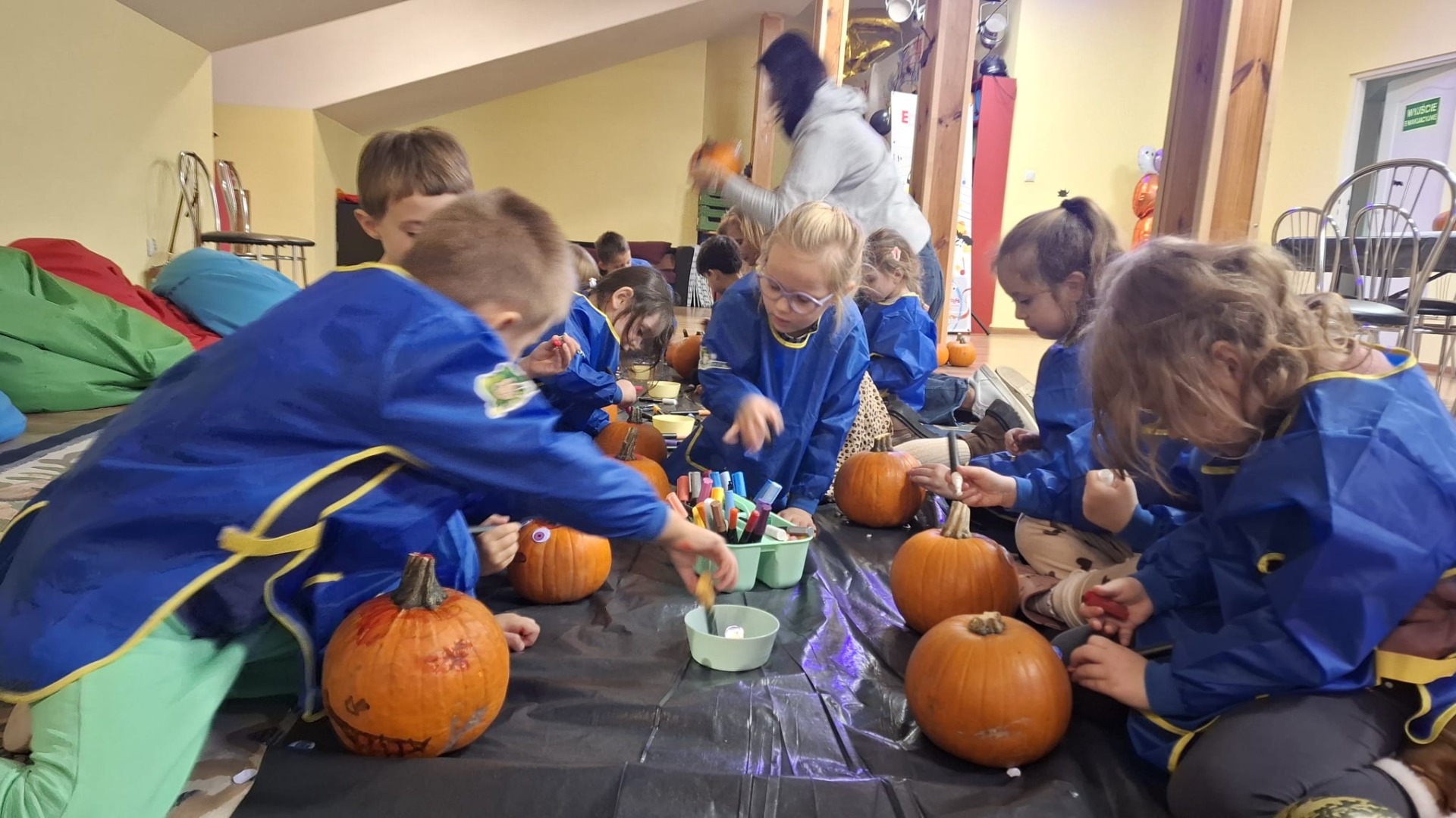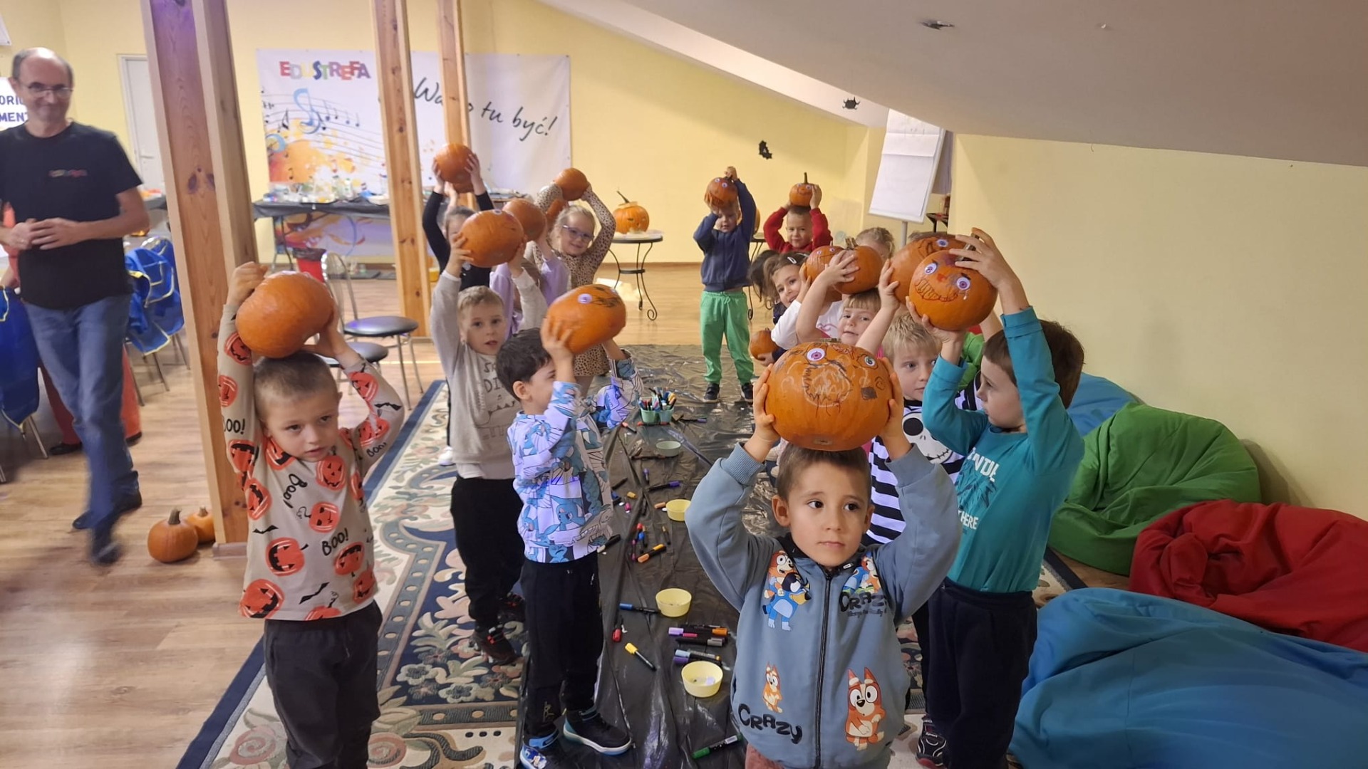 Każde dziecko dostało również dynię, na której mogło wykonać własną, kreatywną postać dyniową. Za pomocą flamastrów, przyklejanych elementów, oczu, nosów i innych dekoracji dzieci tworzyły wesołe dyniowe twarze, rozwijając wyobraźnię i zdolności manualne.