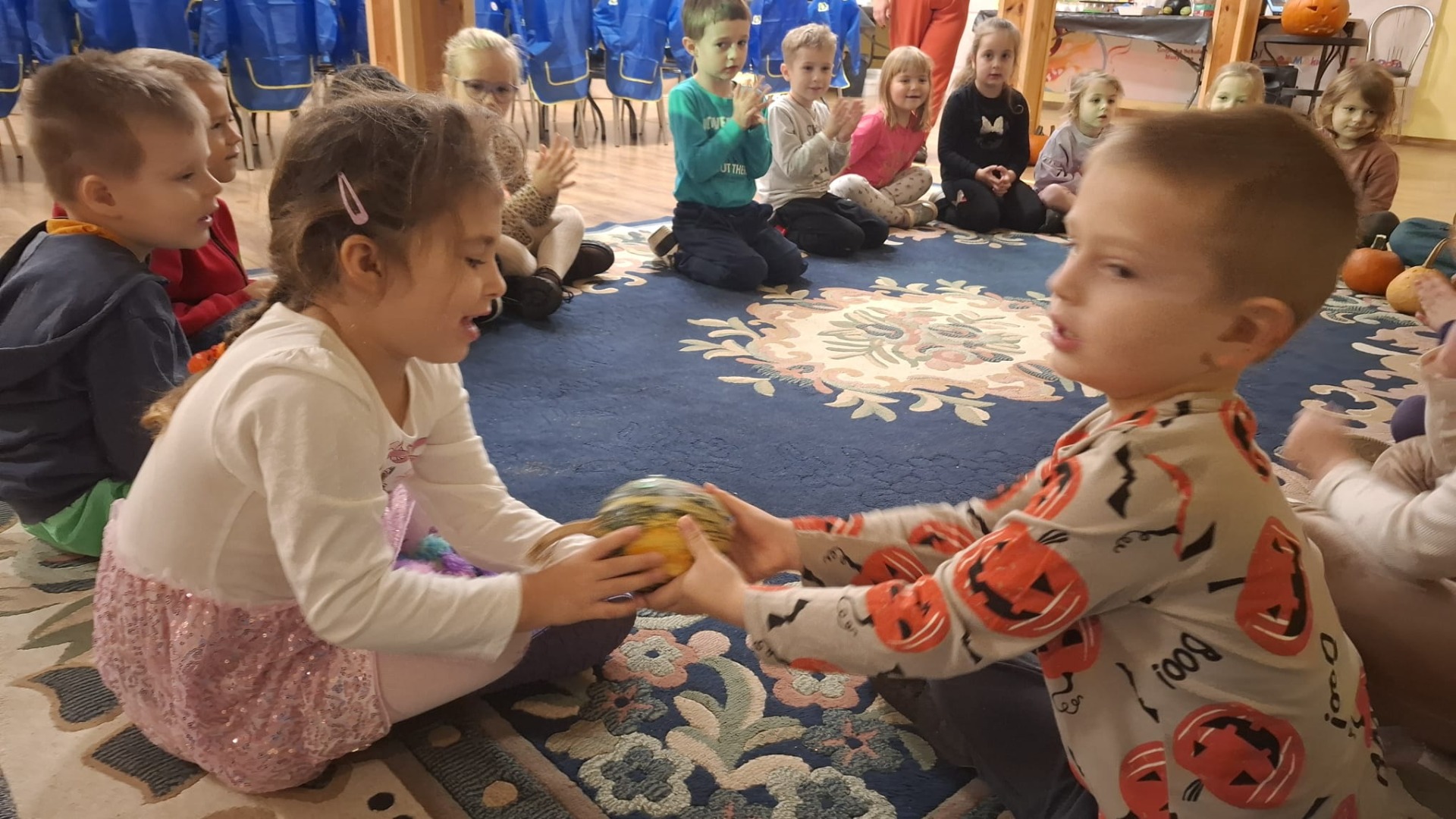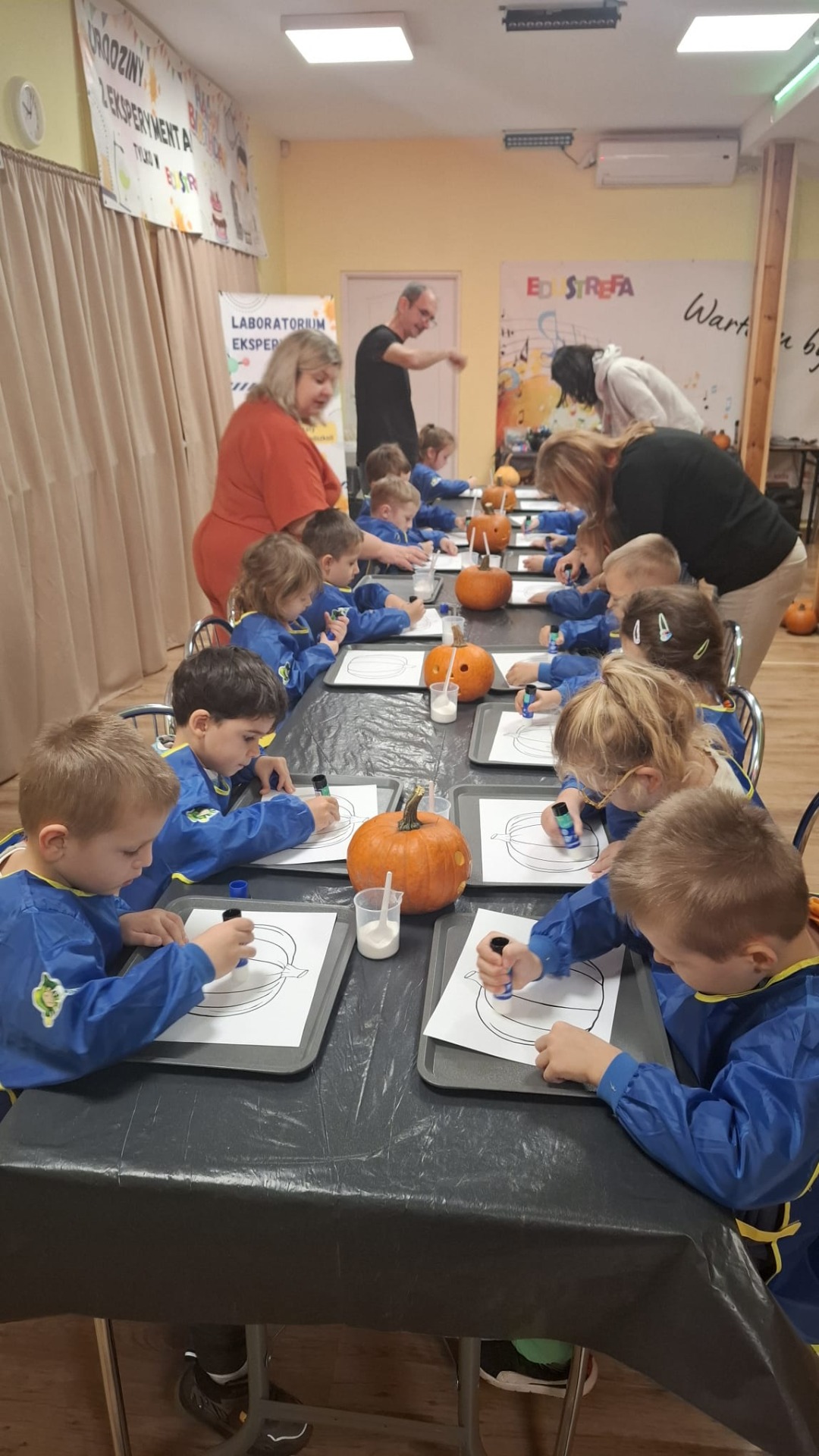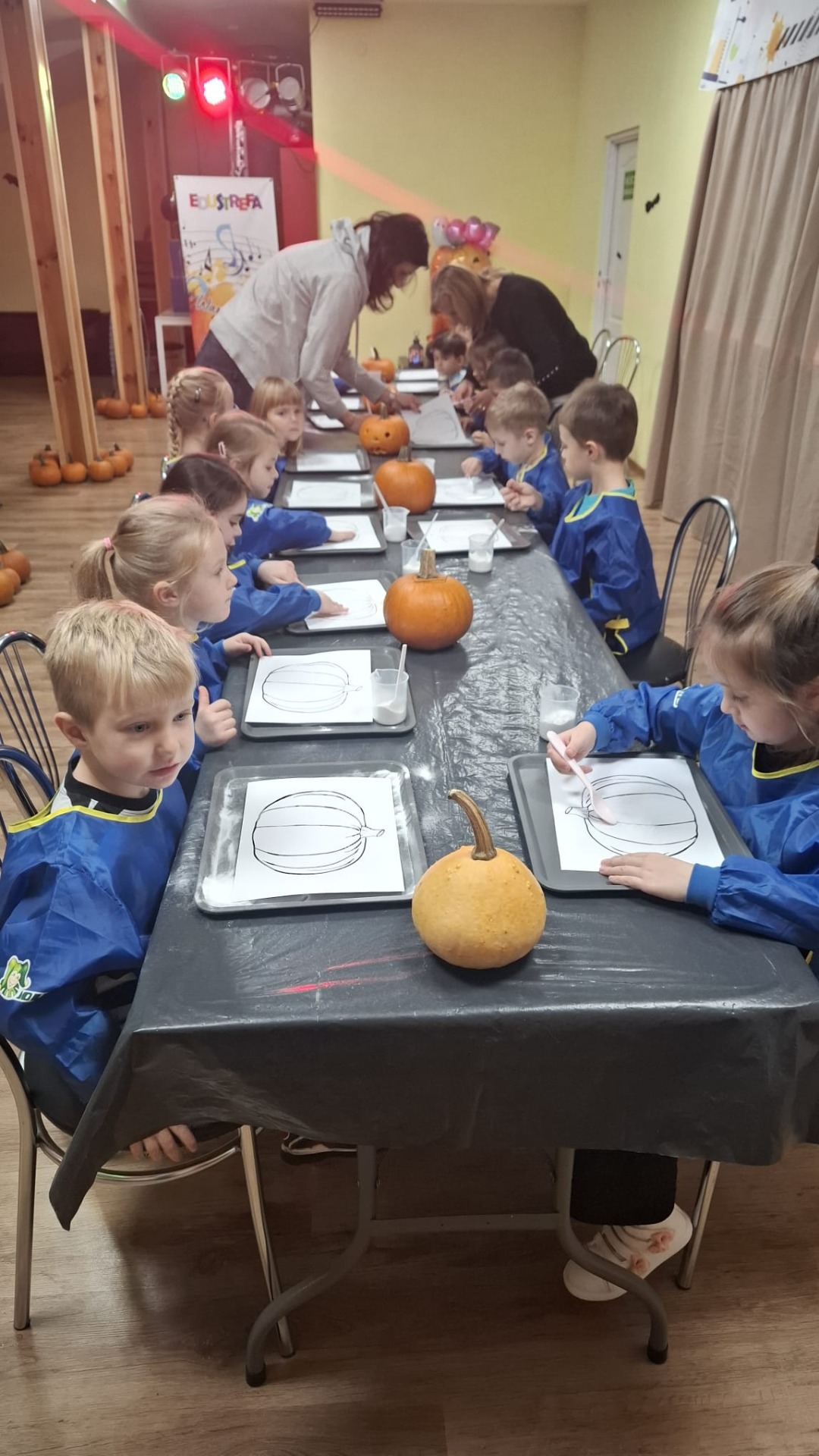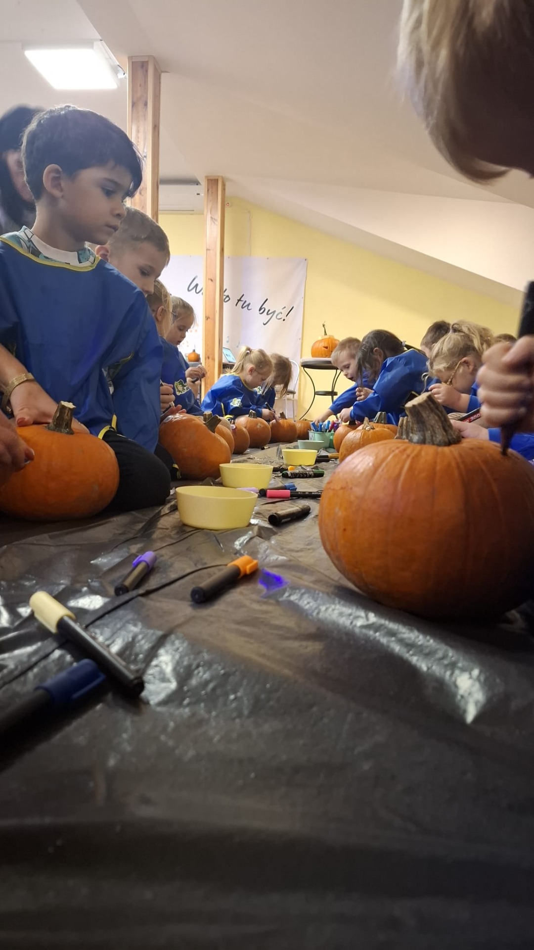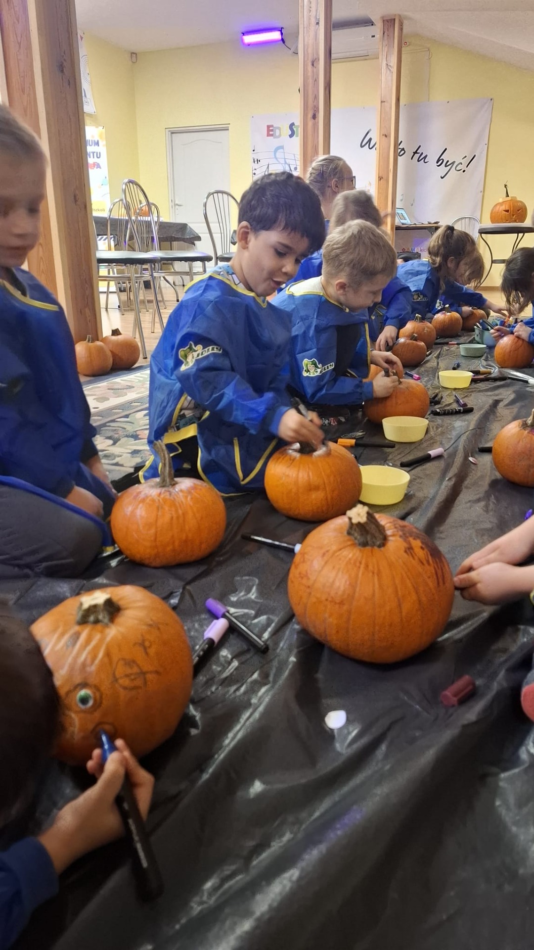 Każde dziecko dostało również dynię, na której mogło wykonać własną, kreatywną postać dyniową. Za pomocą flamastrów, przyklejanych elementów, oczu, nosów i innych dekoracji dzieci tworzyły wesołe dyniowe twarze, rozwijając wyobraźnię i zdolności manualne.
