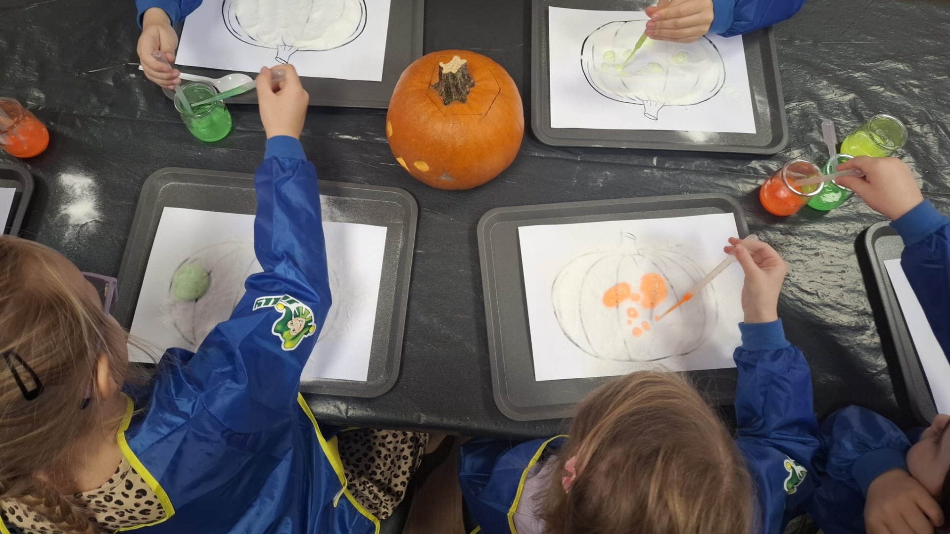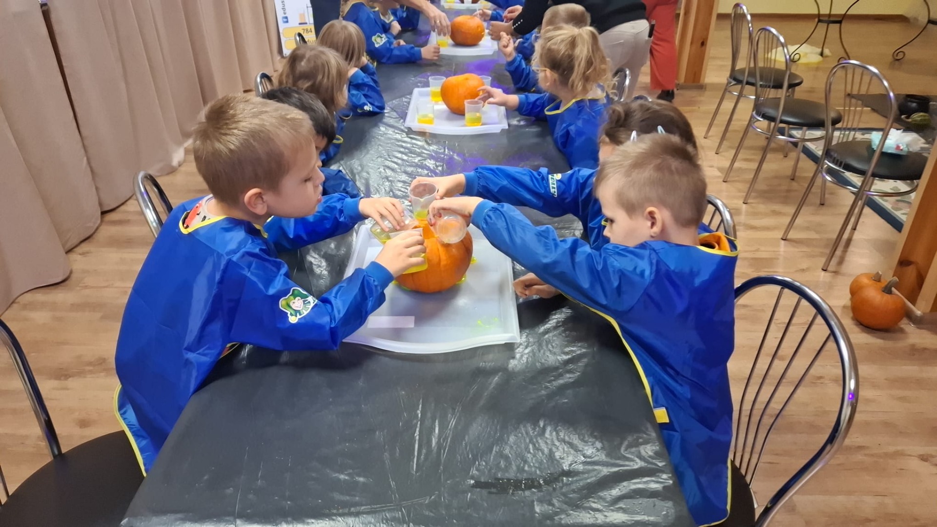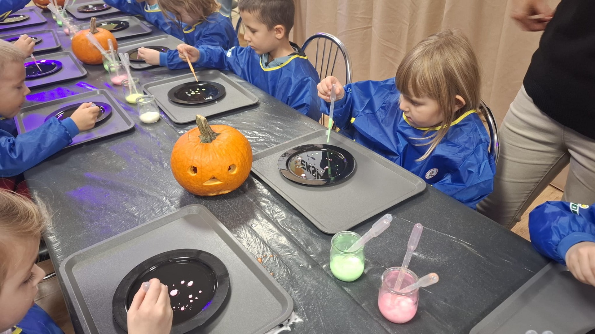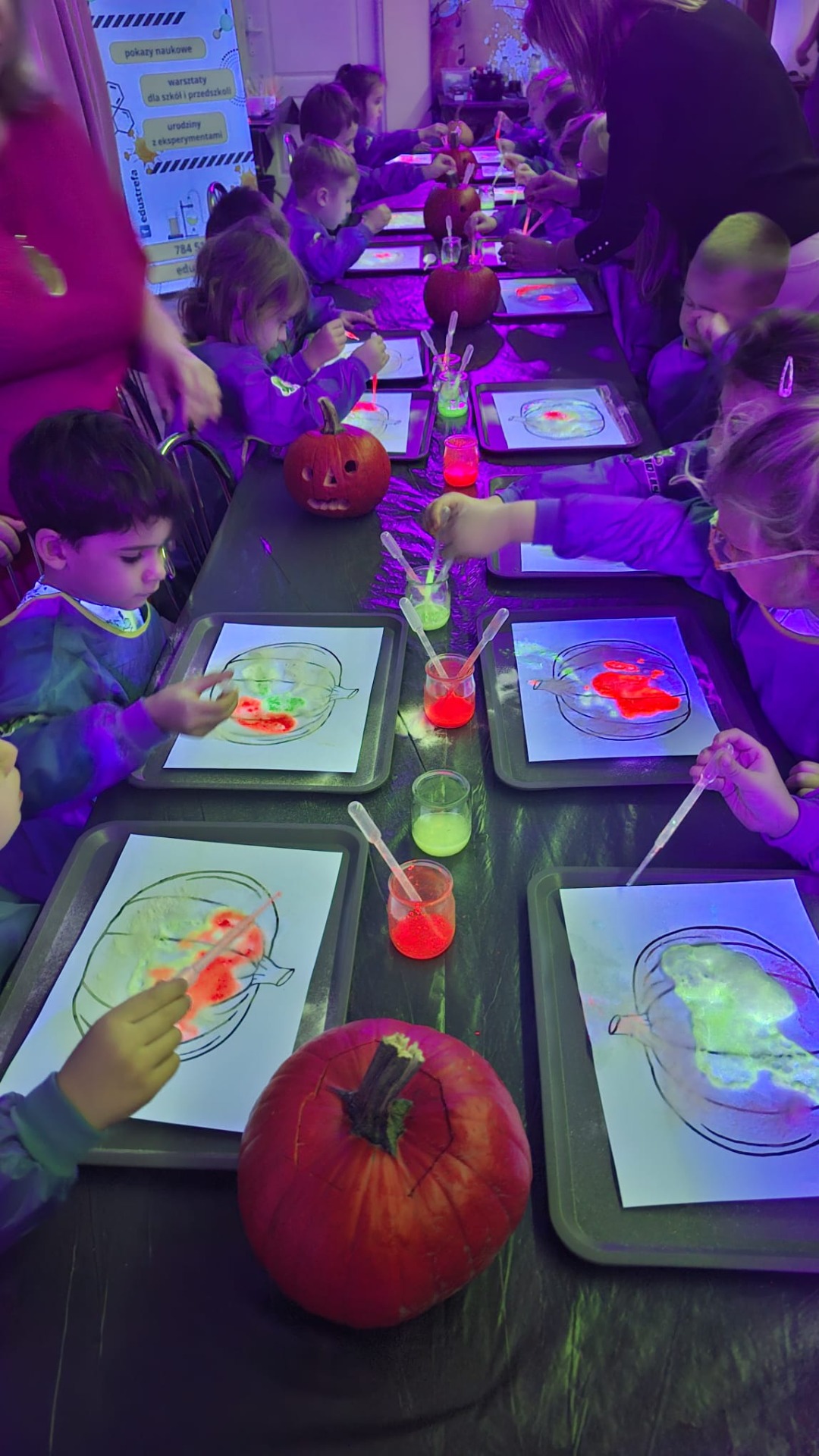 Na początku dzieci oglądały dynie różnej wielkości i rozmawiały z prowadzącymi o tym, co można z nich zrobić oraz jak można je wykorzystać w kuchni i w zabawach. Następnie przystąpiły do nietradycyjnej pracy plastycznej i różnego rodzaju eksperymentów, podczas których używały pipet, mieszały różne składniki, obserwowały, jak zmieniają się kolory i struktury, a płyny zamieniały się w puszystą pianę, wywołując podziw i radość. Ogromne zdziwienie sprawiło dzieciom to, że po zgaszeniu światła ich wykonane prace świeciły w ciemności.