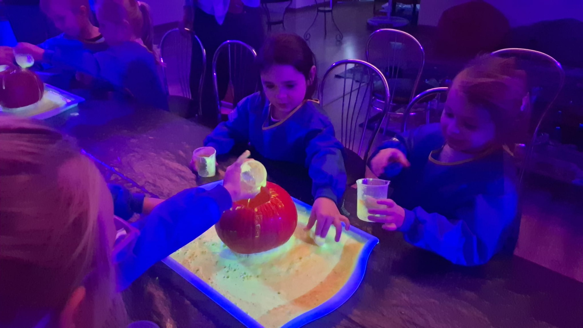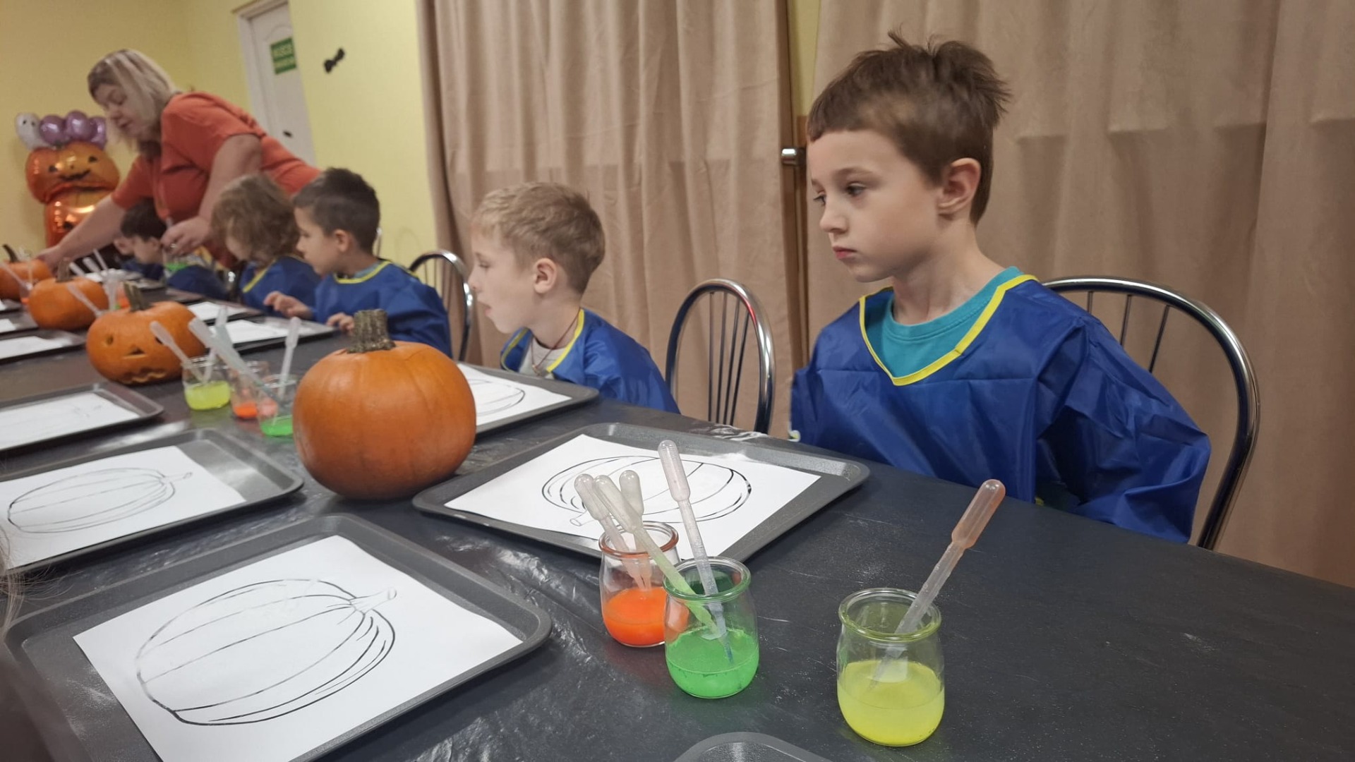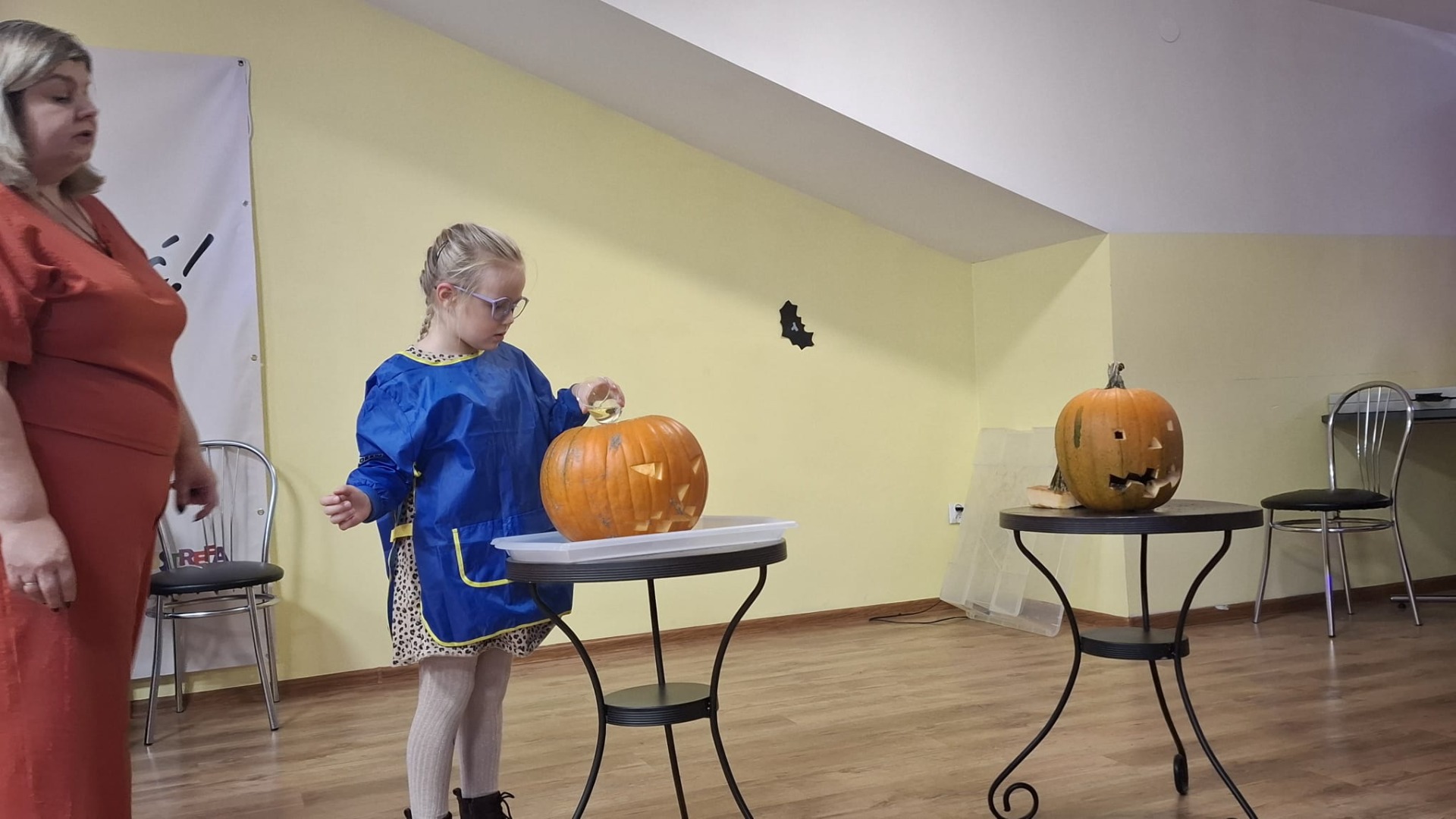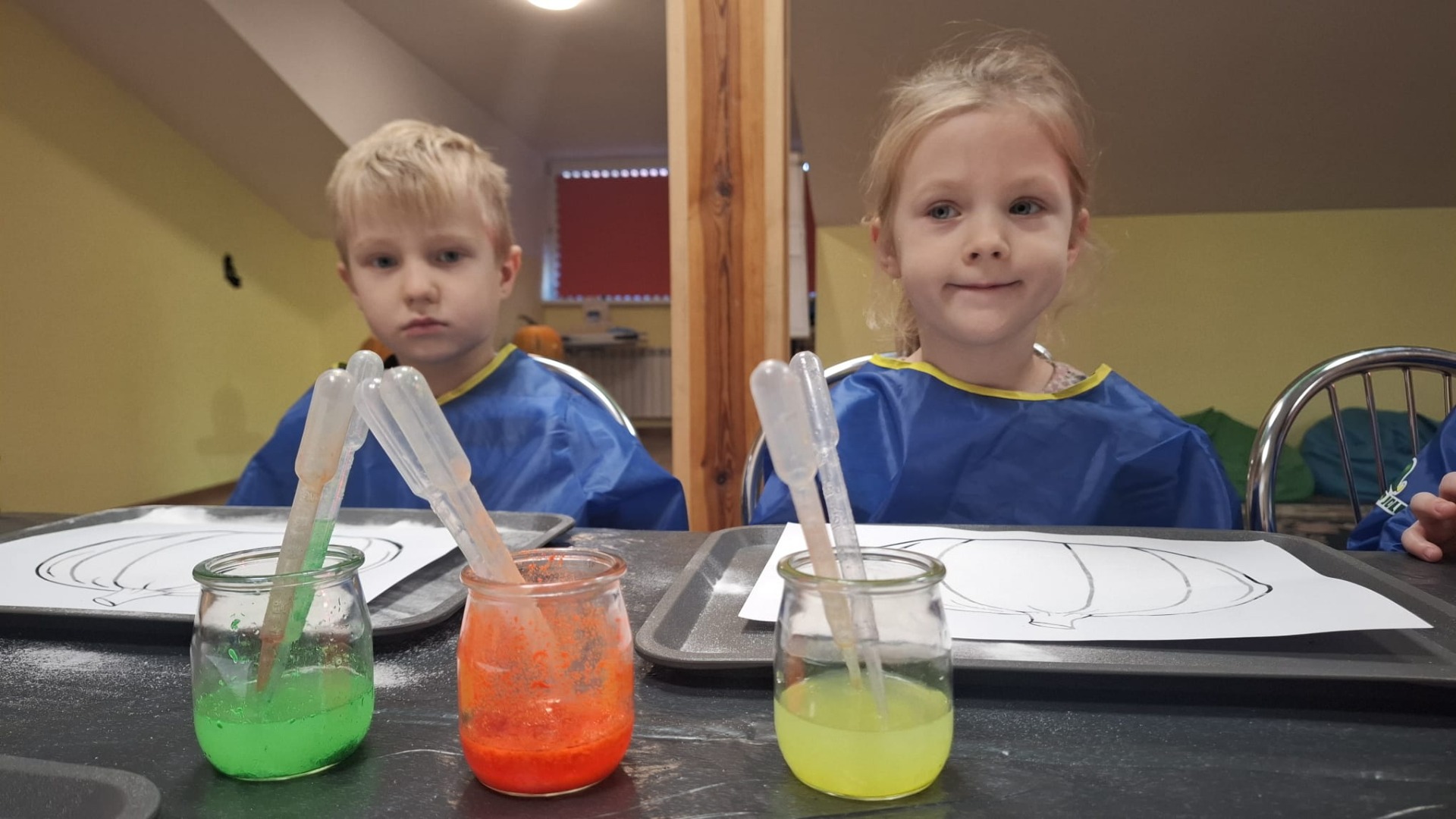 Na początku dzieci oglądały dynie różnej wielkości i rozmawiały z prowadzącymi o tym, co można z nich zrobić oraz jak można je wykorzystać w kuchni i w zabawach. Następnie przystąpiły do nietradycyjnej pracy plastycznej i różnego rodzaju eksperymentów, podczas których używały pipet, mieszały różne składniki, obserwowały, jak zmieniają się kolory i struktury, a płyny zamieniały się w puszystą pianę, wywołując podziw i radość. Ogromne zdziwienie sprawiło dzieciom to, że po zgaszeniu światła ich wykonane prace świeciły w ciemności.