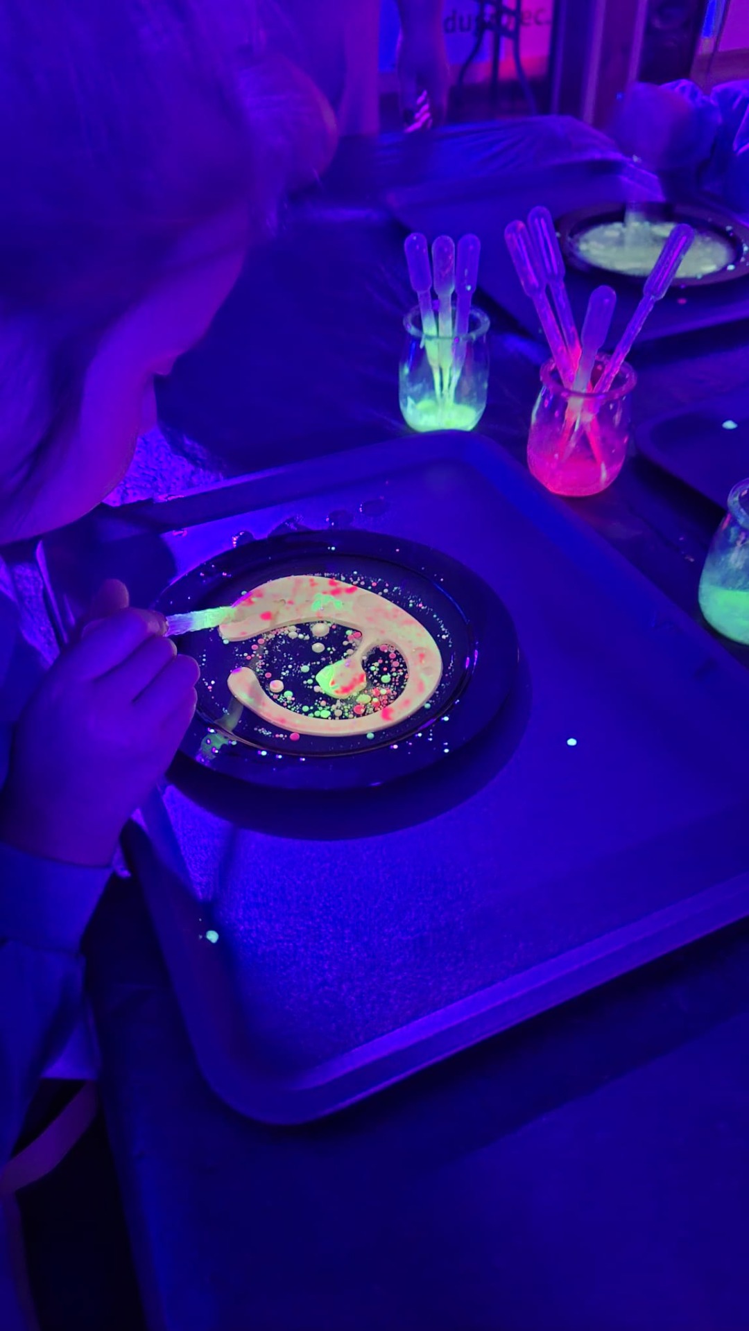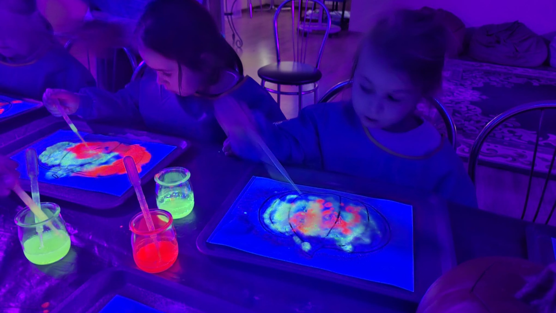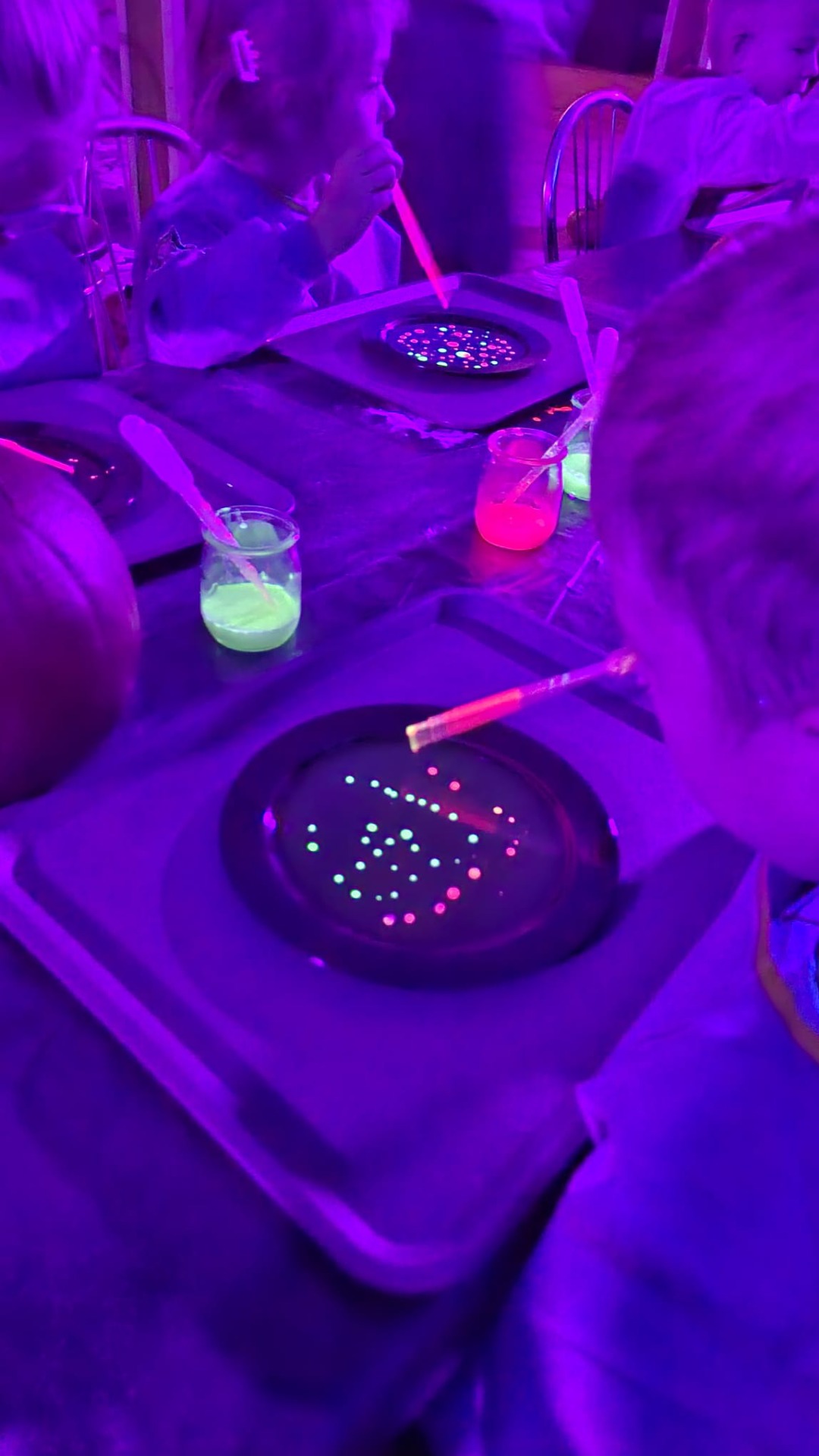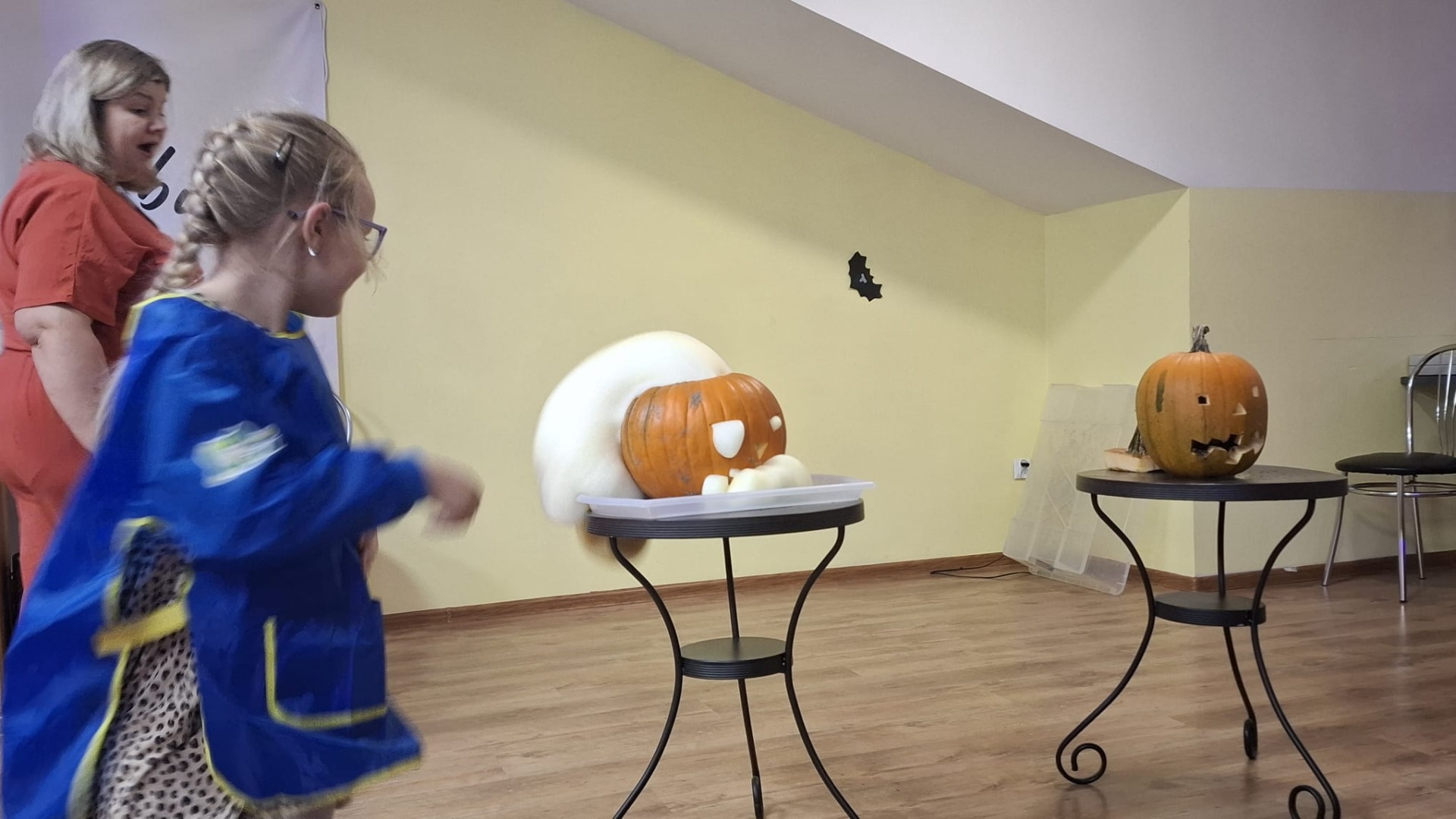 Na początku dzieci oglądały dynie różnej wielkości i rozmawiały z prowadzącymi o tym, co można z nich zrobić oraz jak można je wykorzystać w kuchni i w zabawach. Następnie przystąpiły do nietradycyjnej pracy plastycznej i różnego rodzaju eksperymentów, podczas których używały pipet, mieszały różne składniki, obserwowały, jak zmieniają się kolory i struktury, a płyny zamieniały się w puszystą pianę, wywołując podziw i radość. Ogromne zdziwienie sprawiło dzieciom to, że po zgaszeniu światła ich wykonane prace świeciły w ciemności.