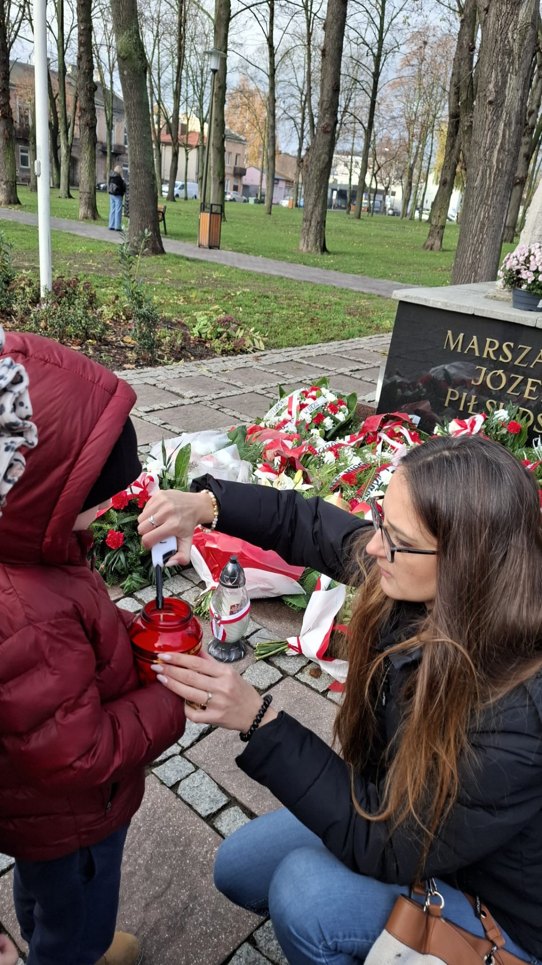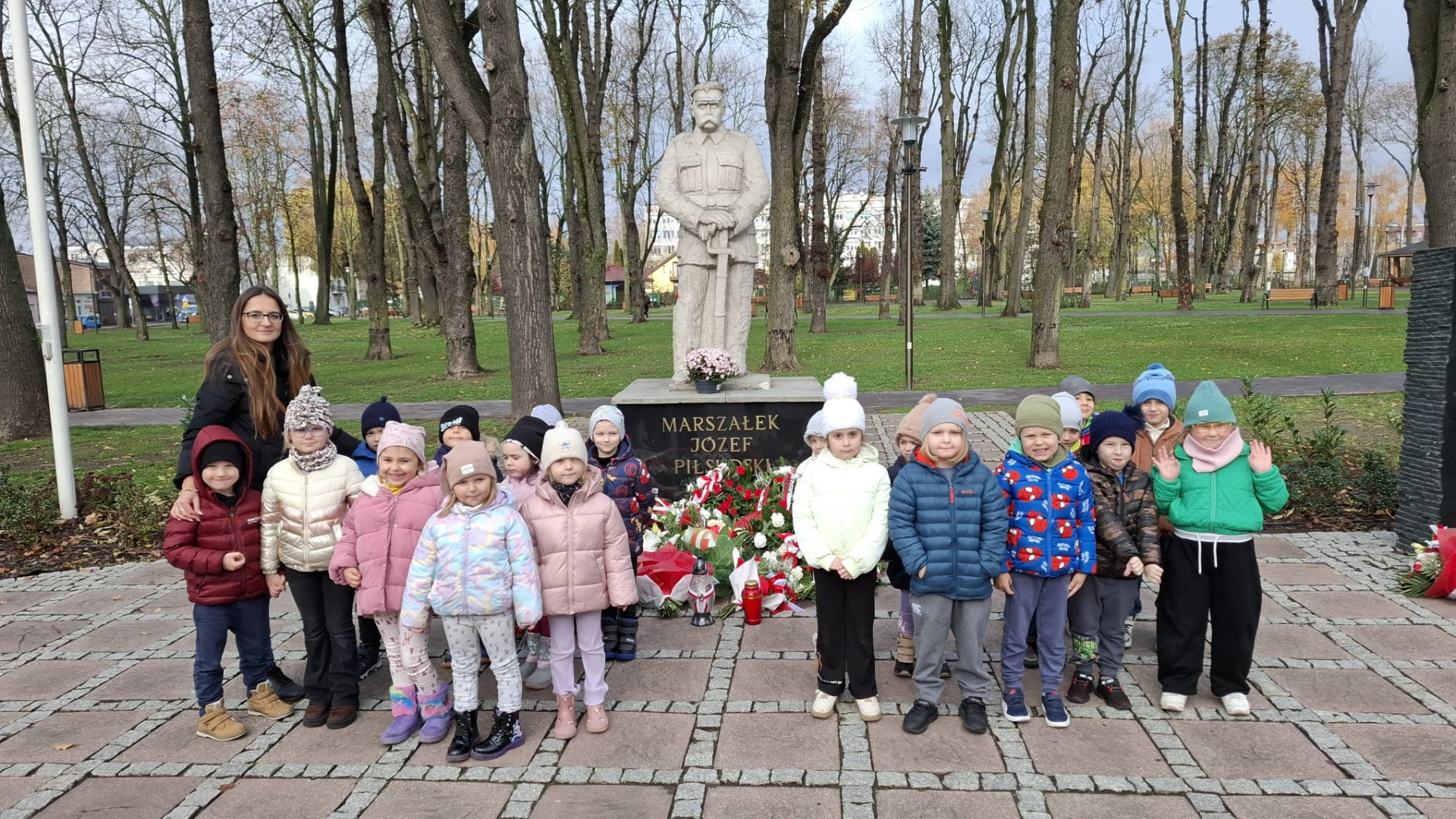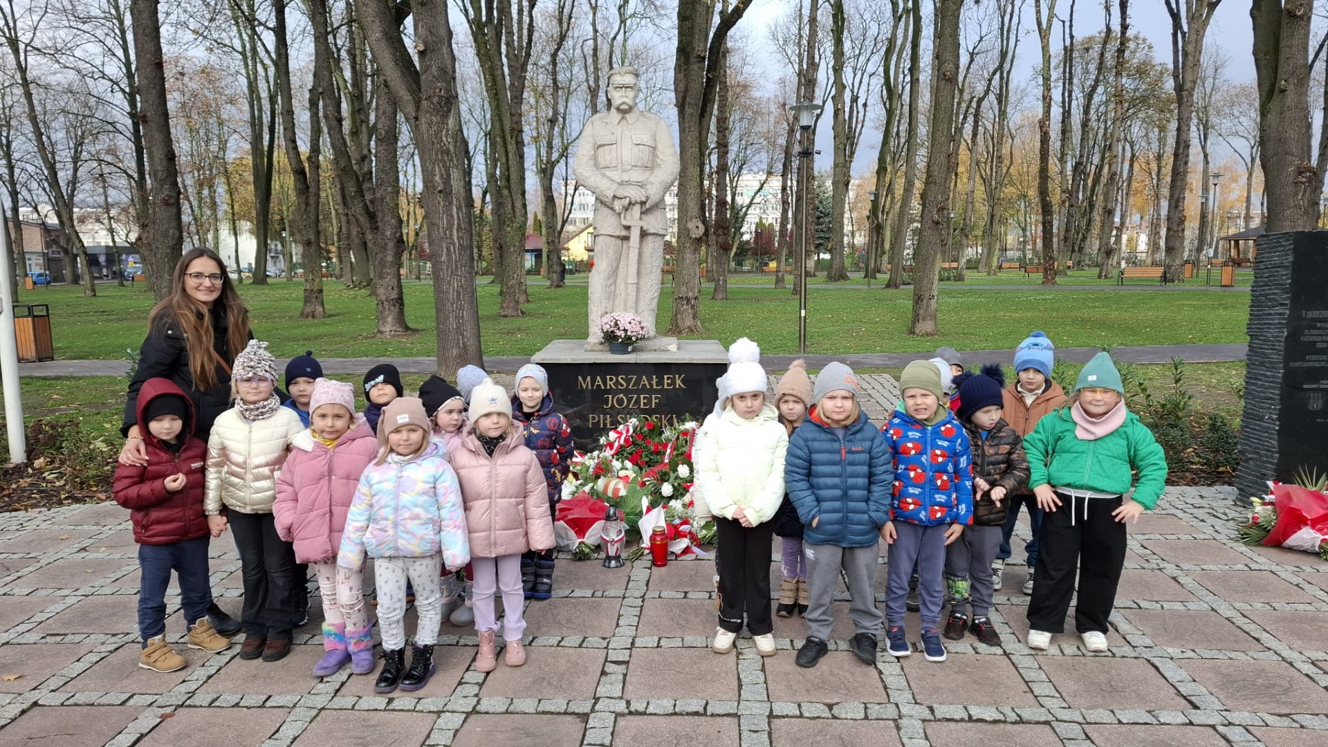 Podczas spaceru przedszkolaki odwiedziły pomnik Marszałka Józefa Piłsudskiego, pod którym wspólnie zapaliły znicz, oddając hołd bohaterom walczącym o wolność naszej Ojczyzny. W tym wyjątkowym miejscu odbyła się również krótka pogadanka na temat niepodległości – dzieci rozmawiały o znaczeniu wolności, symbolach narodowych oraz o tym, dlaczego 11 listopada jest tak ważnym dniem w historii Polski.