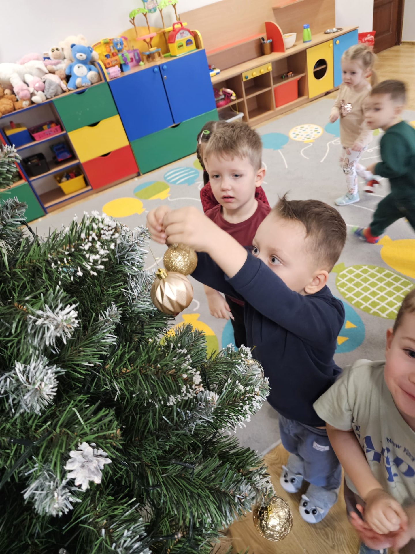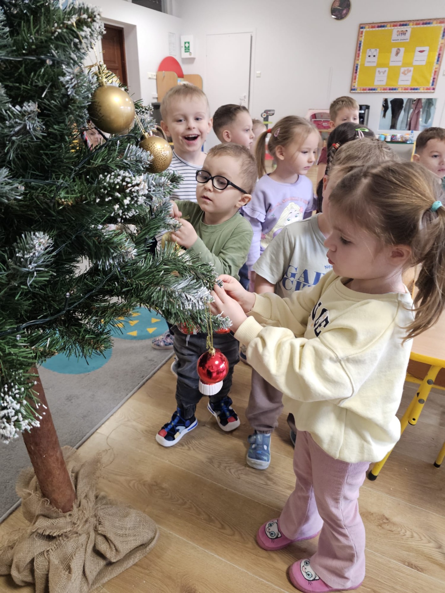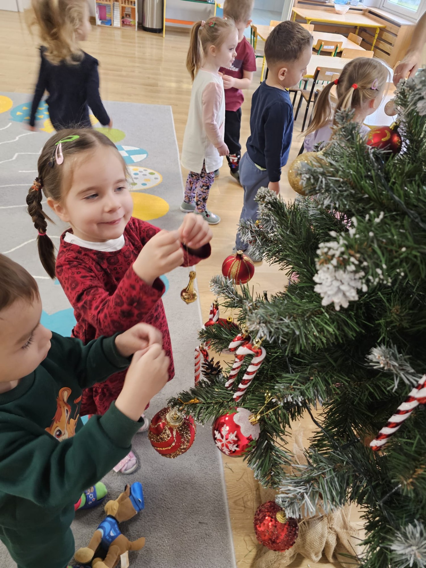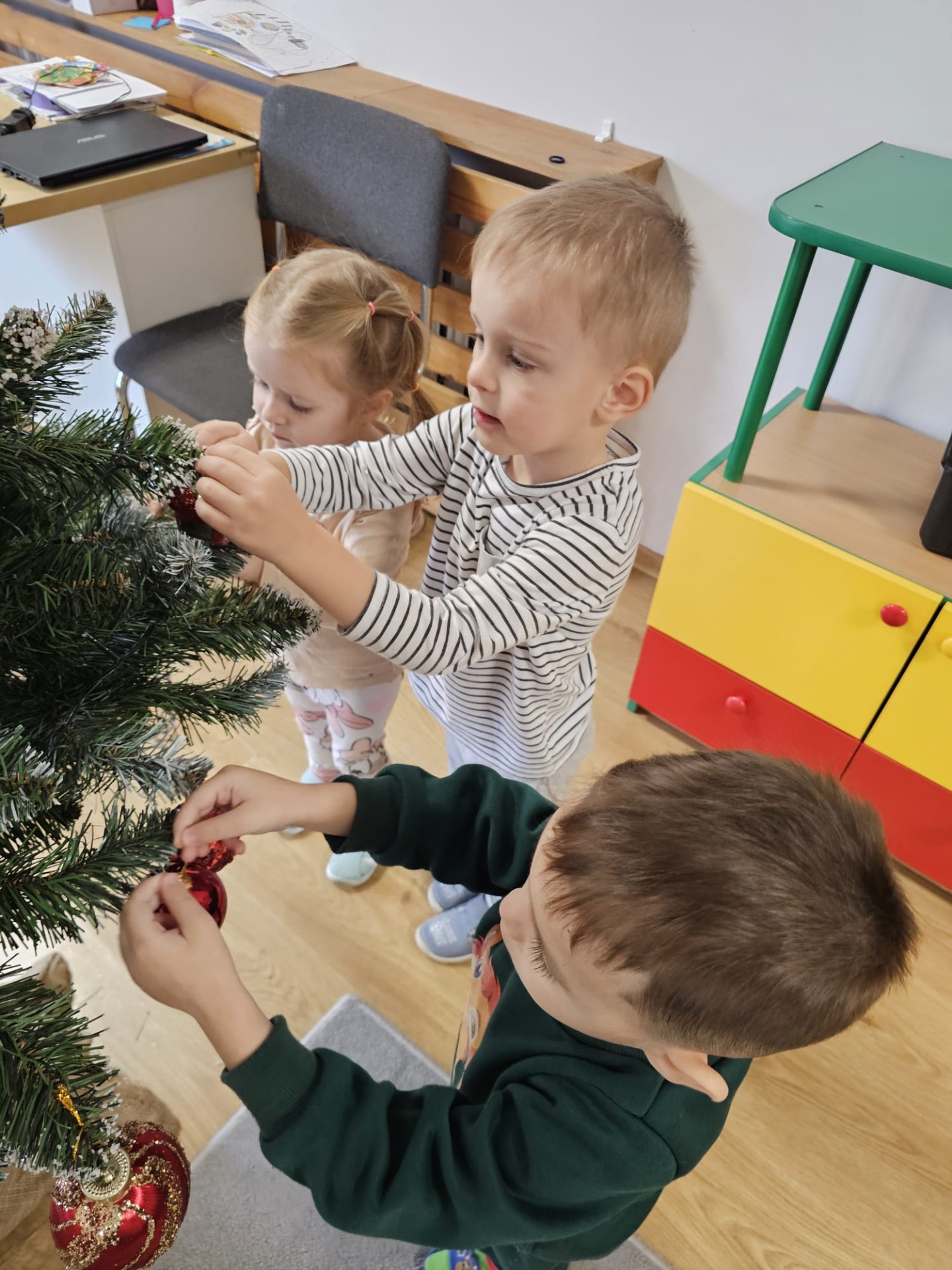 Przy świątecznych piosenkach i uśmiechach maluchy tworzyły magiczny klimat, który od razu wypełnił całą salę. Wspólne ubieranie choinki to piękny moment integracji, współpracy i budowania przedświątecznych tradycji.