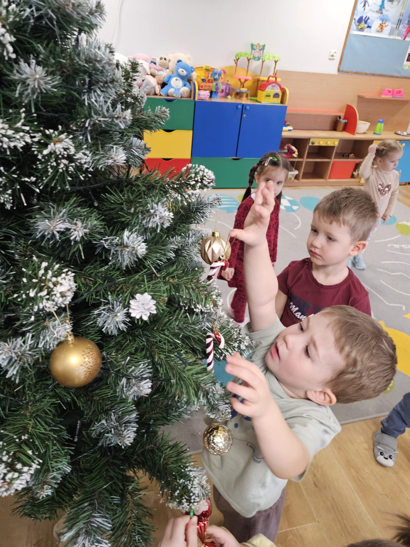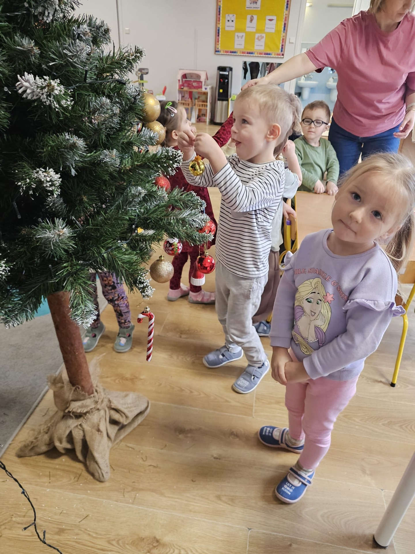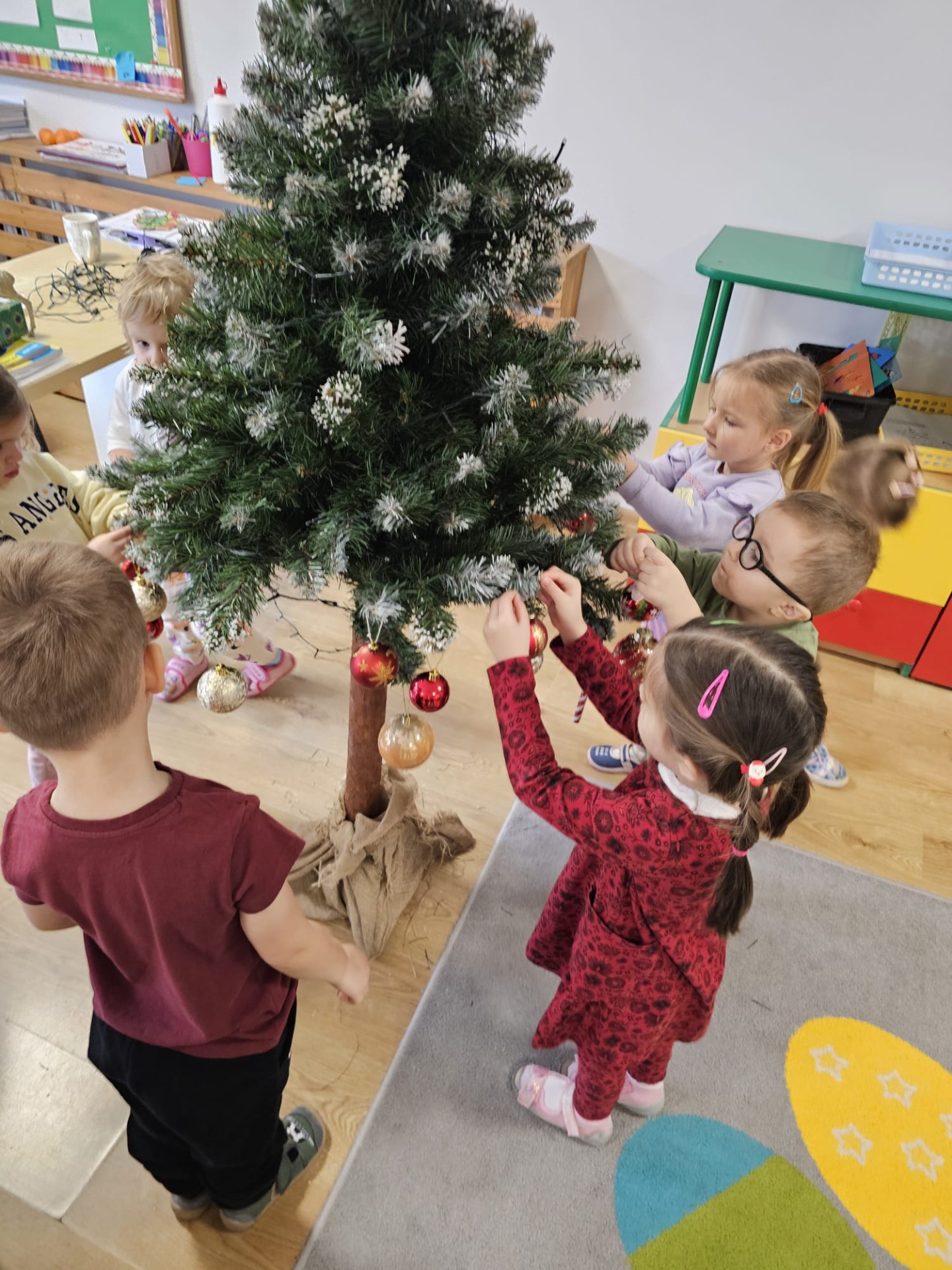 Dnia 2.12.2025 w grupie 1 B wprowadziliśmy świąteczną atmosferę w wyjątkowy sposób — wspólnie ubierając choinkę! Dzieci z ogromnym zaangażowaniem i radością dekorowały drzewko, wybierając bombki i kolorowe ozdoby. Każde dziecko miało okazję zawiesić własną dekorację, co sprawiło, że nasza choinka stała się naprawdę wyjątkowa i pełna dziecięcej kreatywności.