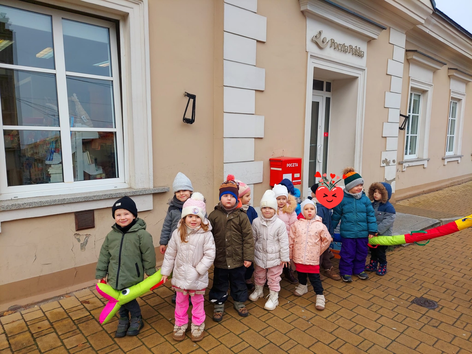 Kolejnym etapem wycieczki była wizyta na pobliskiej poczcie. Dzieci mogły z bliska zobaczyć, jak wygląda skrzynka pocztowa. Przypomnieliśmy wiedzę na temat pracy listonoszów, tradycji wysyłania listów i kartek pocztowych. To wyjątkowe doświadczenie wywołało wiele emocji i uśmiechu, a jednocześnie pozwoliło utrwalić nawyk tradycyjnego pisania i wysyłania korespondencji.